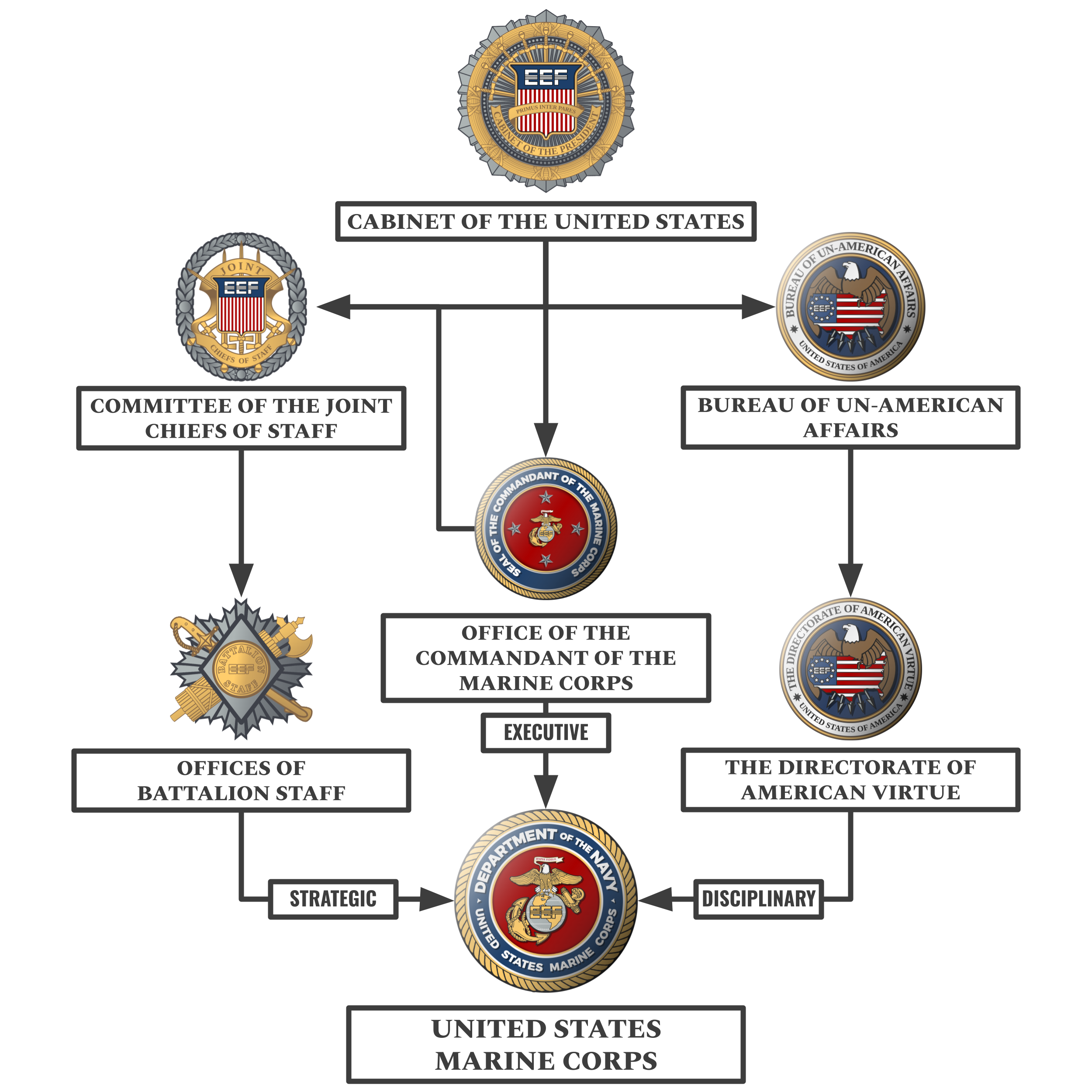 The Chain of command of the United States Armed Forces, or Military Congress of The United States is made up of three arms. The Executive arm, which consist of the Commander-in-chief and Deputy Commander-in-chief, the president and Secretary of Defense, as well as the rest of the Presidents Cabinet. The second arm, Strategic, consists of the Committee of the Joint Chiefs of Staff or JCOS, made up of the three Battalion commandants, the Battalion Vice Commandants, and the Commandant of The Marine Corps. The third branch, Disciplinary, consists of the Bureau of Un-American Affairs, or BUA for short, the Enclaves federal, and military law enforcement entity. The Bureau is followed by the Directorate of American Virtue: the Office of the Director of Un-American Affairs, who, together with his three Commissarys oversee the disciplinary affairs of the Enclave.
